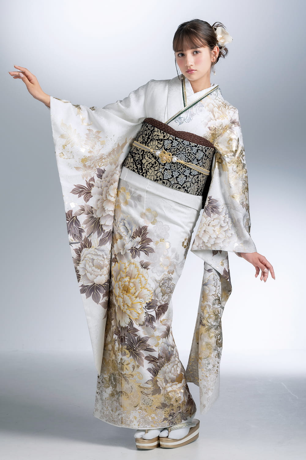 白地に美しい金彩が映える上品でゴージャスな振袖