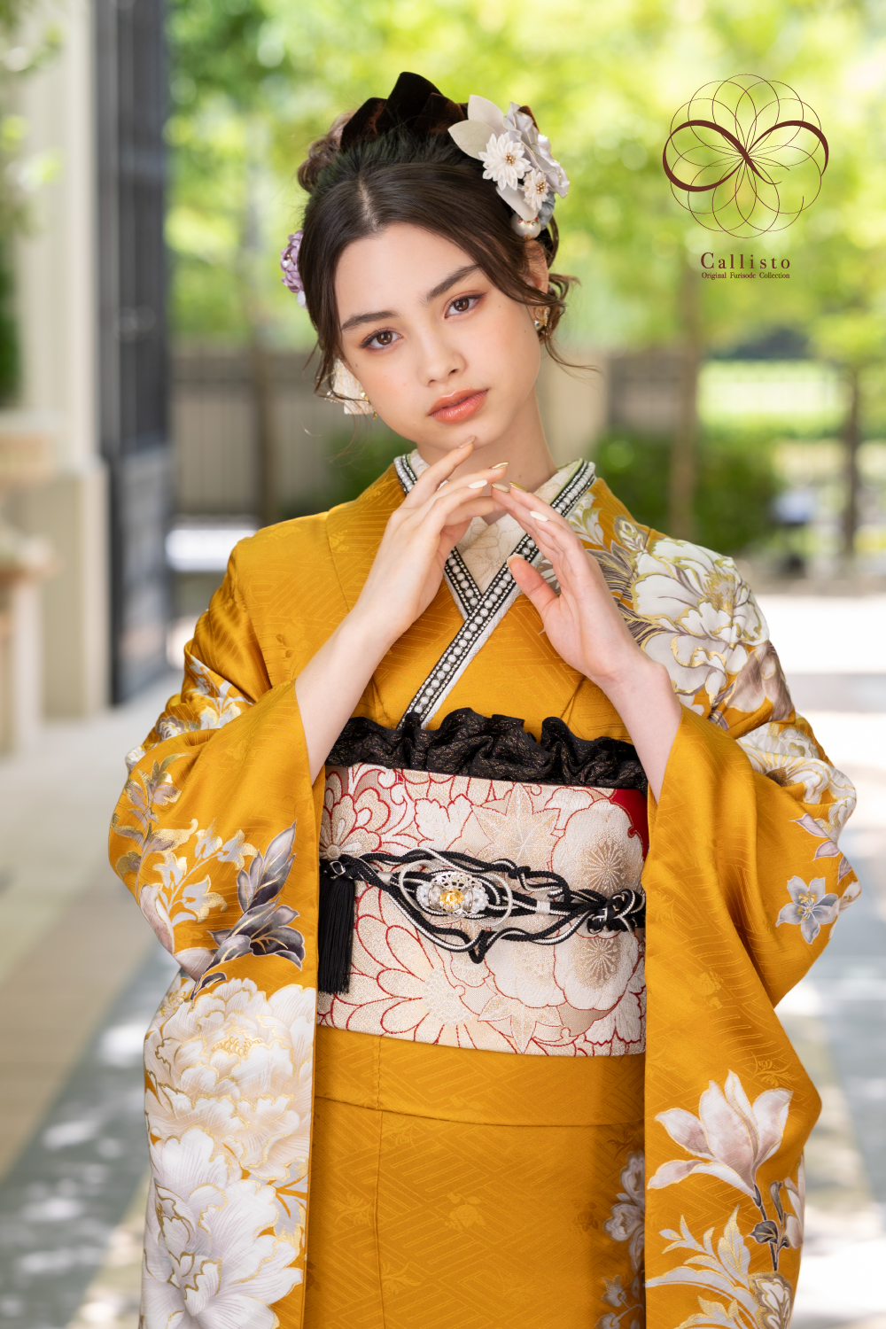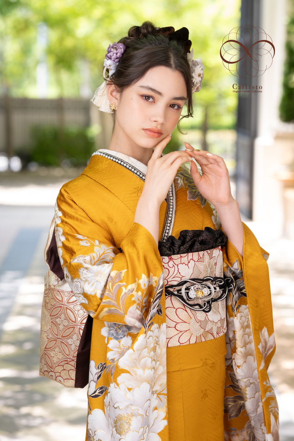 目を引くカラシ色に大輪の牡丹が咲き誇る凛とした装い