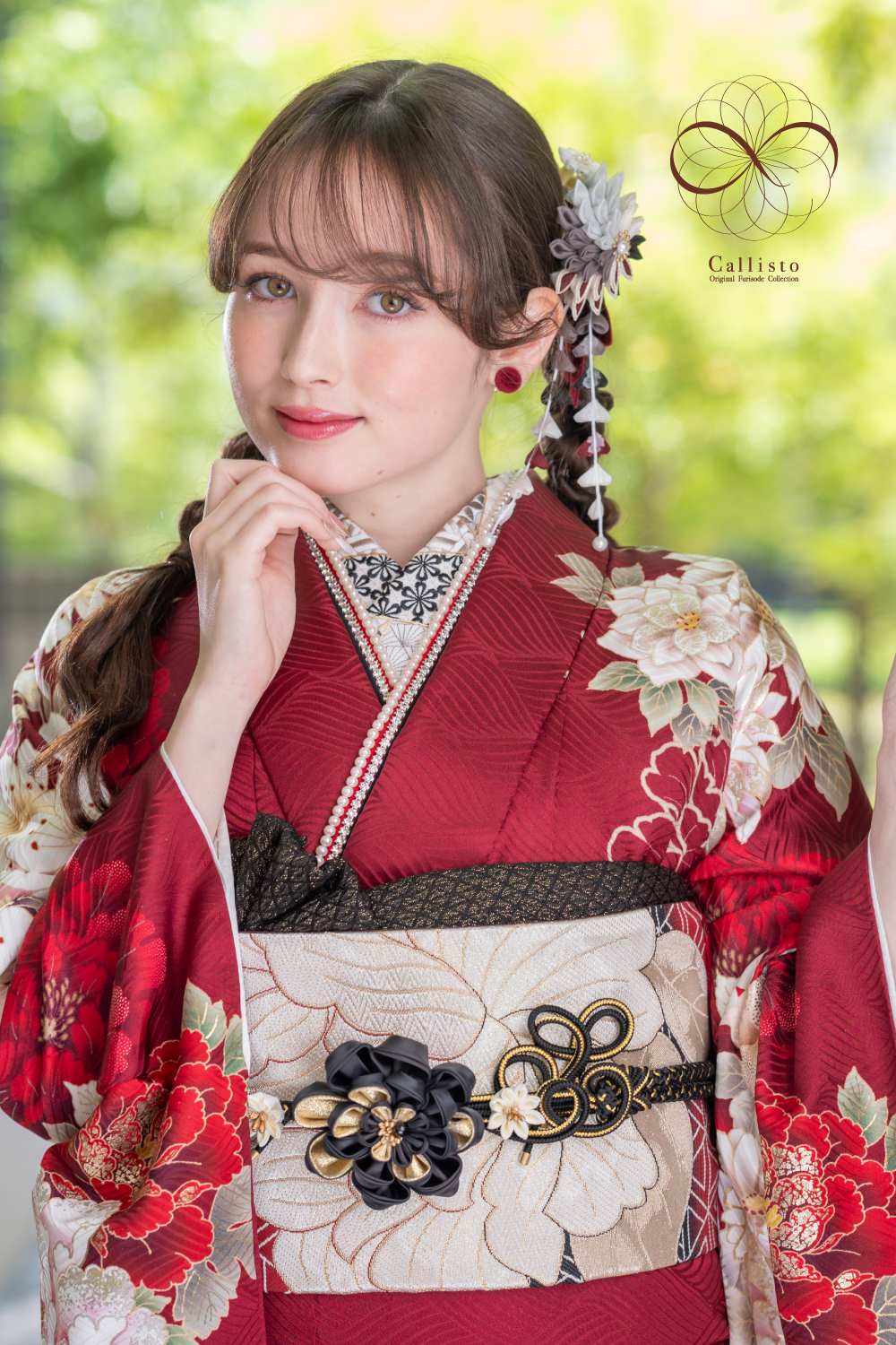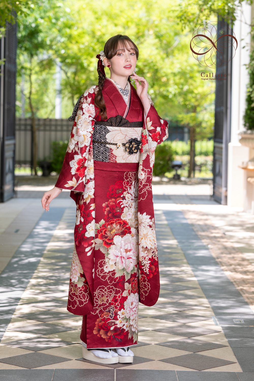 美しい赤に白牡丹が浮かび上がる華やかな一枚