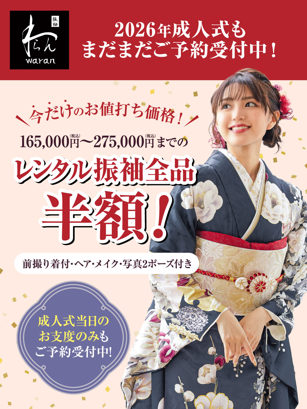 レンタルするなら今がチャンス!たくさんの振袖の中からお気に入りの1着を見つけよう!