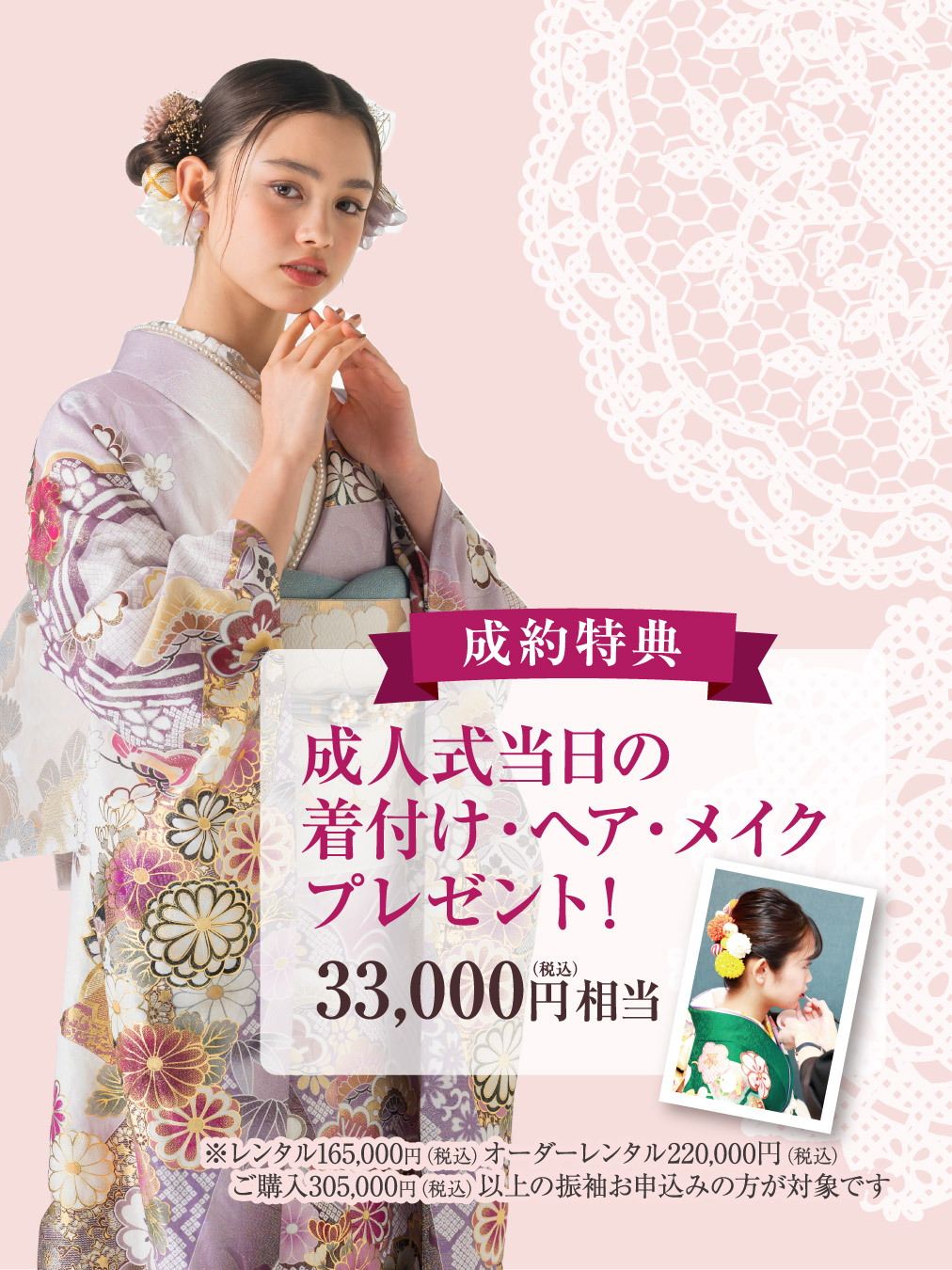 ※レンタル165,000円(税込)、オーダーレンタル220,000円(税込)、ご購入308,000円(税込)以上の振袖お申し込みの方が対象です。