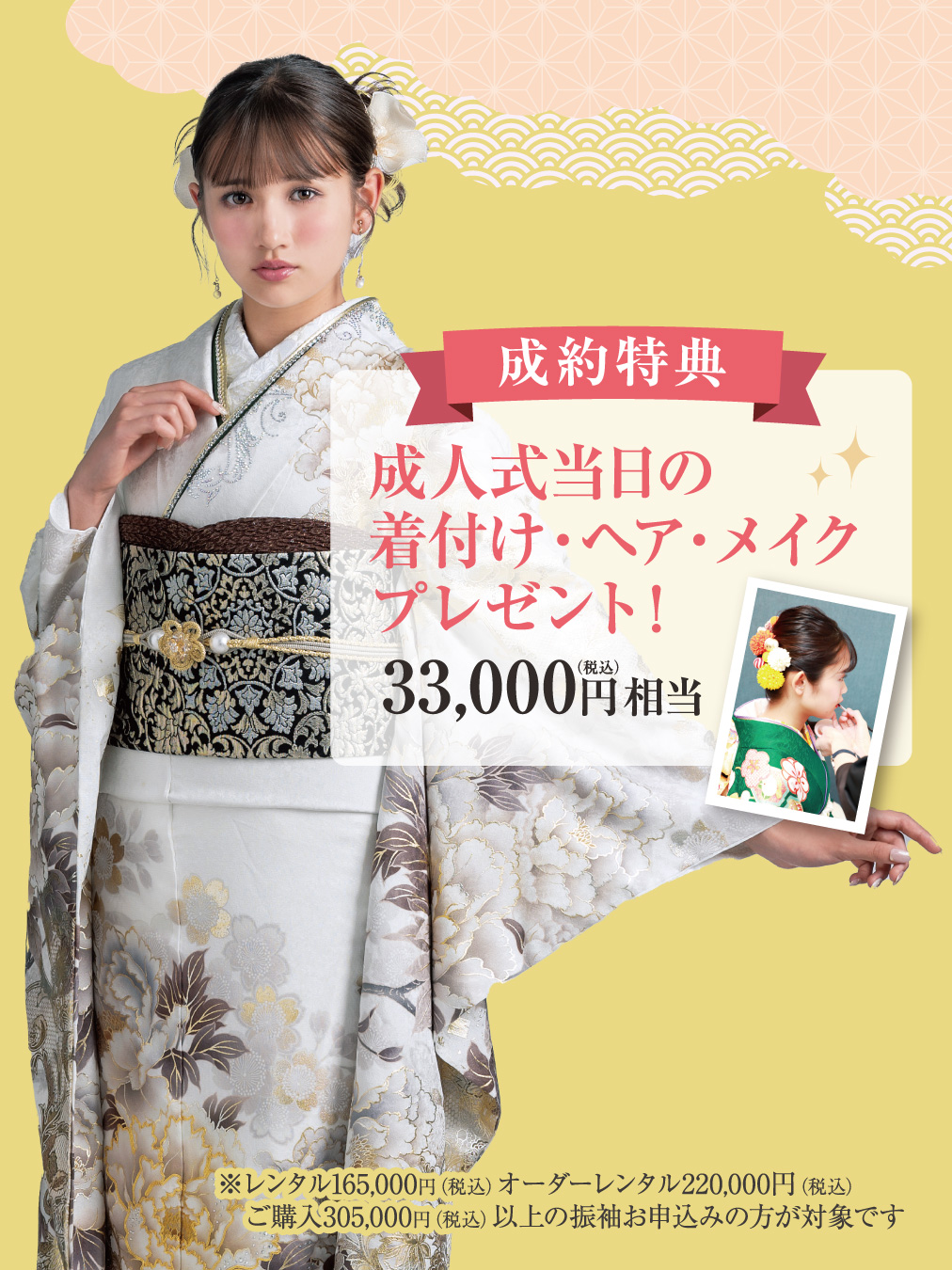 ※レンタル165,000円(税込)、オーダーレンタル220,000円(税込)、ご購入308,000円(税込)以上の振袖お申し込みの方が対象です。
