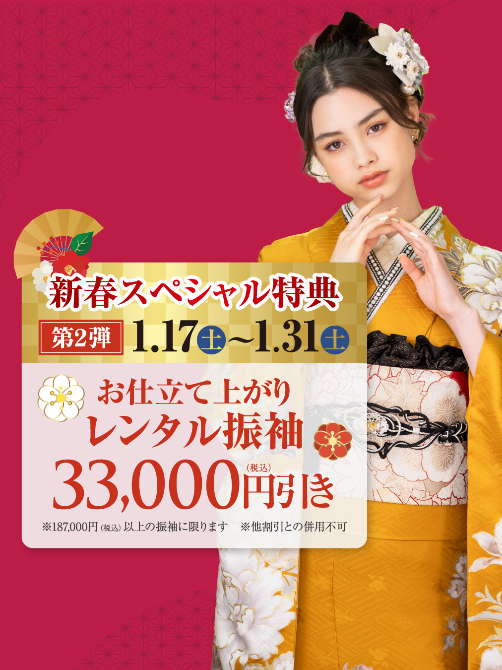 お仕立て上がりレンタル振袖33,000円(税込)割引
